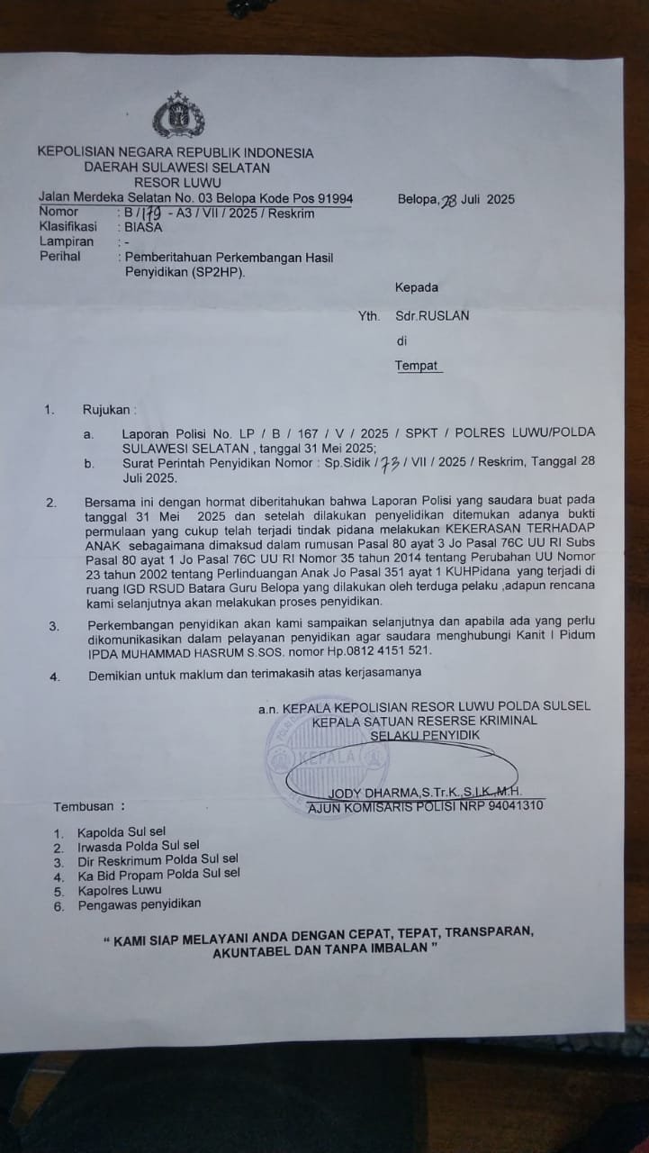 Berdasarkan laporan polisi dengan nomor LP/B/167/V/2025/SPKT/POLRES LUWU/POLDA SULAWESI SELATAN tertanggal 31 Mei 2025, serta tindak lanjut SP2HP nomor B/179 A.1.1/VI/2025/Reskrim, kepolisian telah menerima aduan dan sedang melakukan penyidikan. Namun, lambannya proses hukum menimbulkan tanda tanya besar di tengah masyarakat.