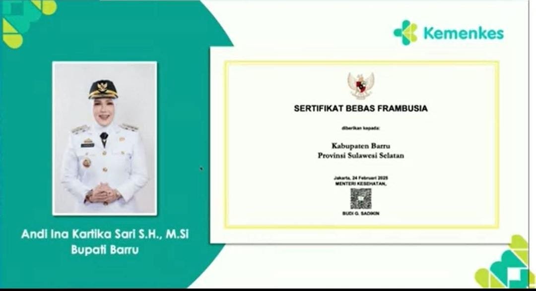 Sertifikat ini diserahkan sebagai bentuk pengakuan atas keberhasilan Barru dalam menekan dan mengeliminasi penyakit frambusia di wilayahnya.