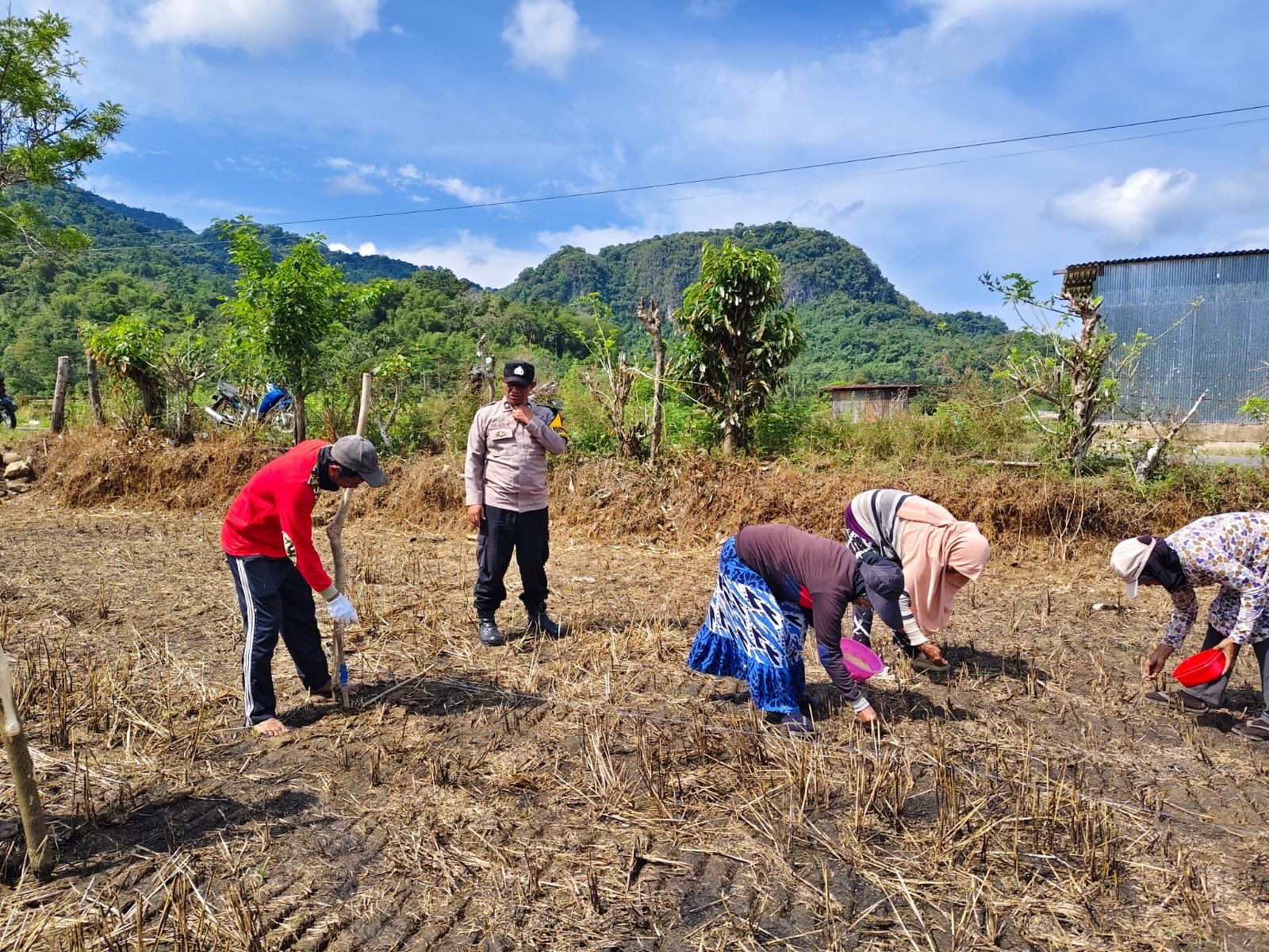 Dengan penuh semangat, Aipda Abd. Azis ikut serta membantu proses penanaman, sekaligus menjalin komunikasi yang lebih akrab dengan para petani. Kehadirannya di tengah-tengah warga tidak hanya sebagai aparat keamanan, tetapi juga sebagai mitra yang peduli terhadap kesejahteraan masyarakat.