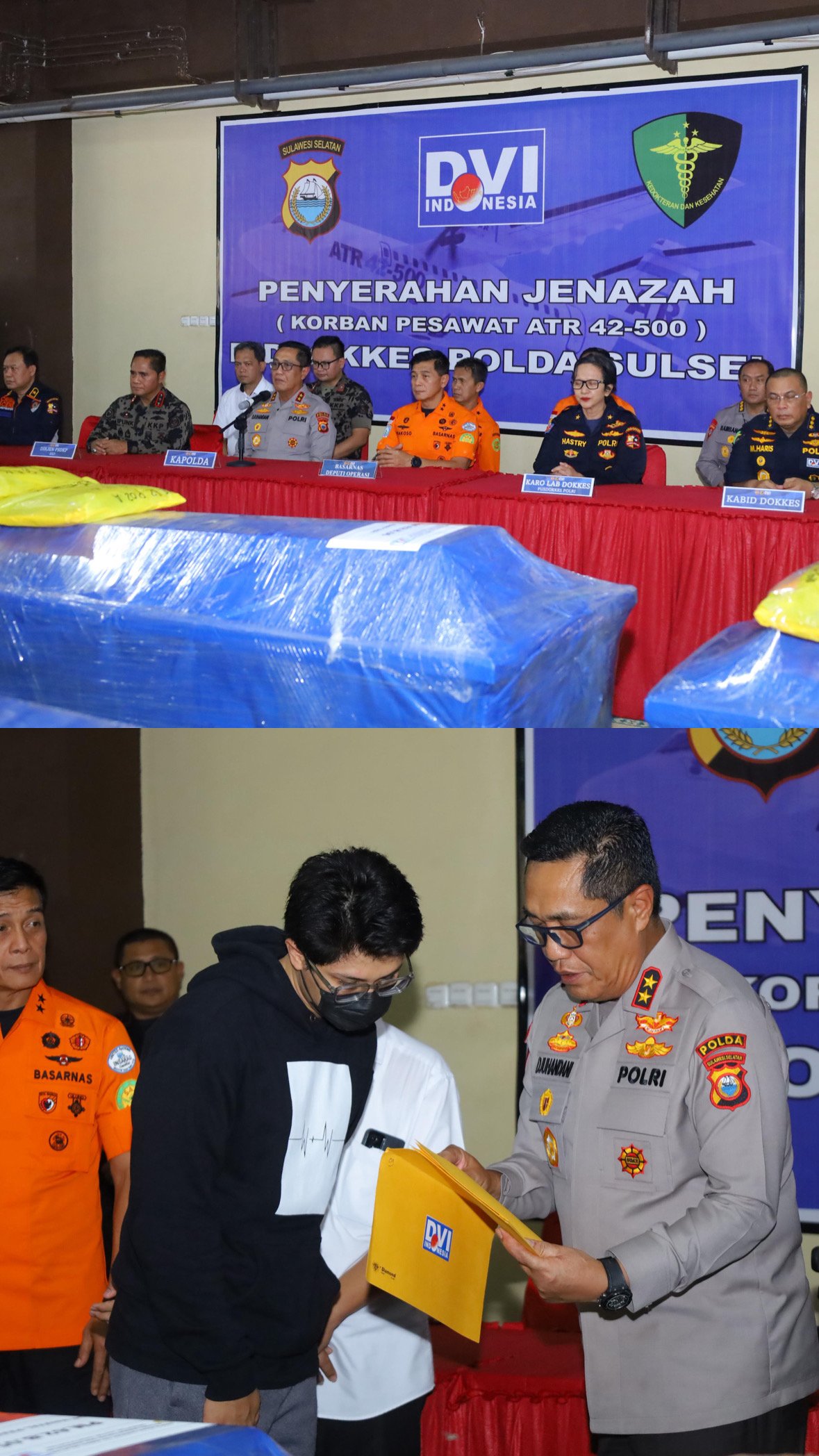 Dalam sambutannya, Kapolda Sulsel menyampaikan duka cita yang mendalam kepada seluruh keluarga korban atas musibah yang terjadi. Ia menegaskan bahwa Polri bersama seluruh unsur terkait telah berupaya maksimal dalam proses evakuasi dan identifikasi jenazah korban pesawat ATR 42-500.
