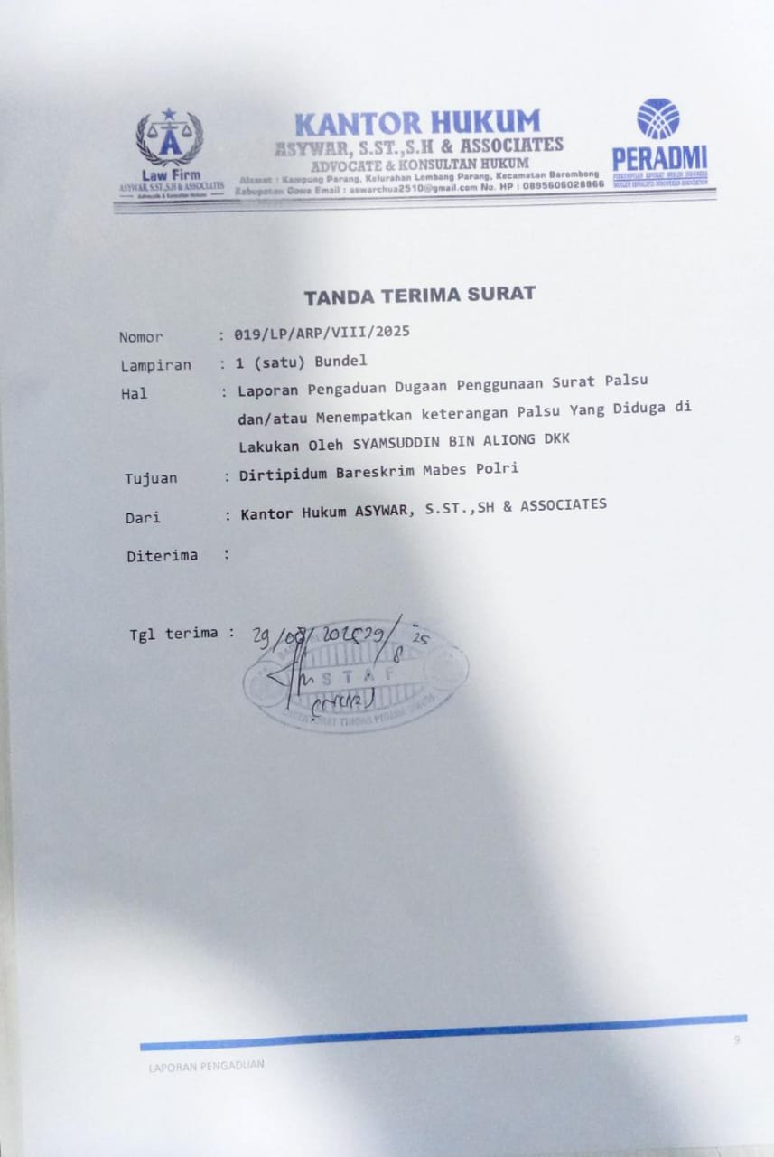 Bidik-jurnalis.com Gowa, 5 September 2025 – Dugaan praktik mafia tanah kembali mencuat di Kabupaten Gowa, Sulawesi Selatan. Keluarga ahli waris almarhum Pak Raki, melalui kuasa hukumnya, Asywar, S.T., S.H., resmi melaporkan seorang oknum berinisial SM ke Direktorat Tindak Pidana Umum (Dirtipidum) Bareskrim Polri atas dugaan pemalsuan dokumen dalam penerbitan Sertifikat Hak Milik (SHM).