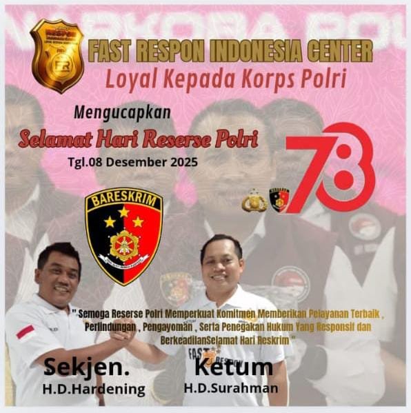 Bidik-jurnalis.com Makassar, 6 Desember 2025 – Fast Respon Indonesia Center (FRIC) di bawah kepemimpinan Ketua Umum H. D. Surahman dan Sekretaris Jenderal H. D. Hardening menyampaikan ucapan selamat serta penghargaan setinggi-tingginya kepada seluruh jajaran Reserse Kepolisian Negara Republik Indonesia yang memperingati Hari Reserse Polri ke-78 pada tanggal 8 Desember 2025.
