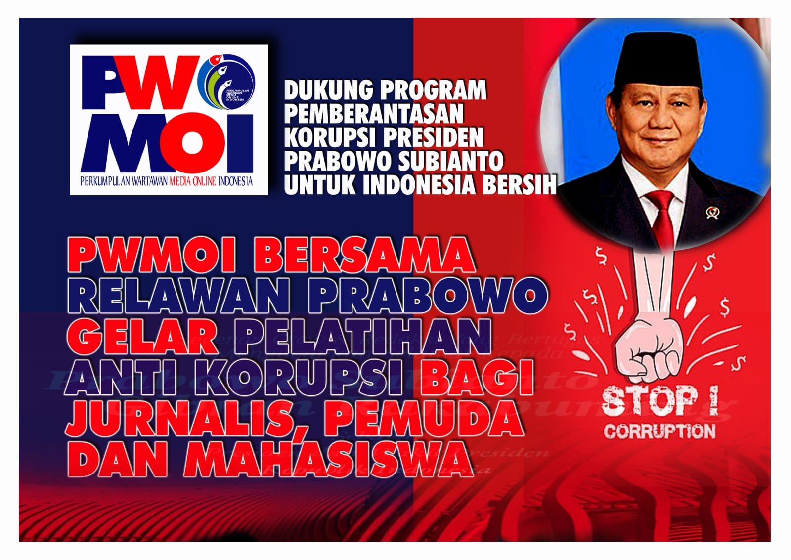 Bidik-jurnalis.com, Jakarta — PWMOI (Perkumpulan Wartawan Media Online Indonesia) gandeng Relawan Prabowo gelar pelatihan anti korupsi bagi jurnalis, pemuda dan mahasiswa guna mendukung komitmen Presiden Prabowo dalam memberantas korupsi di Bumi Nusantara