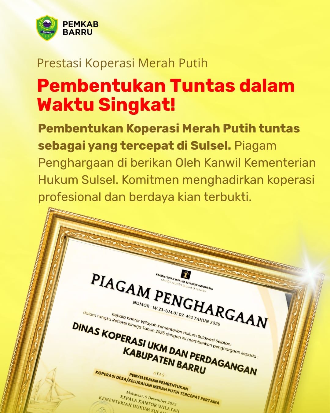 Bidik-jurnalis.com, Barru- Pemerintah Kabupaten Barru kembali menorehkan prestasi membanggakan setelah berhasil merampungkan pembentukan 55 Koperasi Merah Putih di seluruh desa dan kelurahan, dan menjadikan Barru sebagai daerah tercepat di Sulawesi Selatan dalam pelaksanaan program unggulan Presiden Prabowo tersebut.