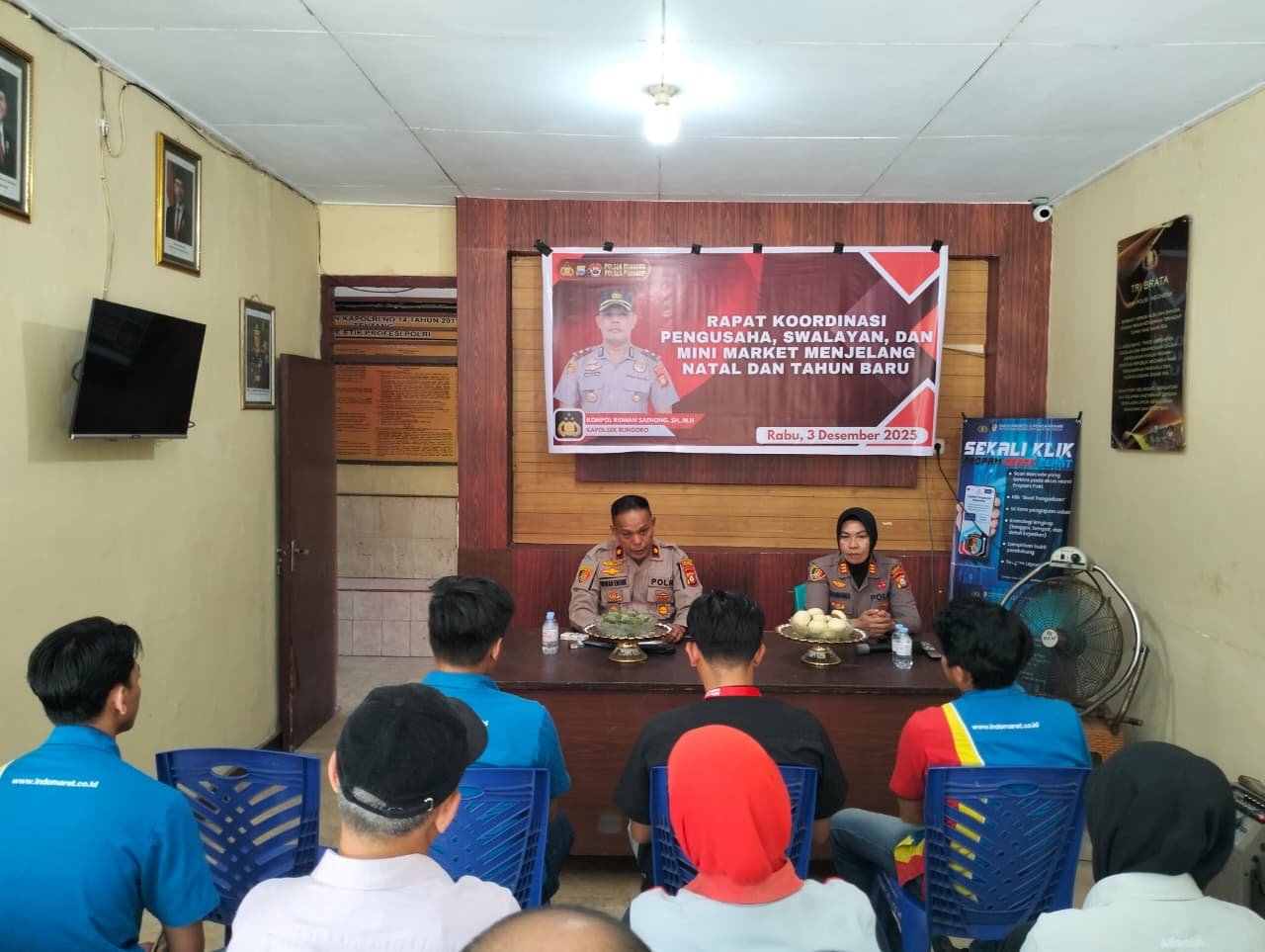 Bidik-jurnalis.com, Pangkep – Dalam rangka memastikan situasi keamanan dan ketertiban masyarakat (Kamtibmas) tetap kondusif menjelang perayaan Natal 2025 dan Tahun Baru 2026, Kapolsek Bungoro Kompol Ridwan Saenong, S.H., M.H. menggelar rapat koordinasi bersama para pelaku usaha, pengelola swalayan, serta minimarket yang berada di wilayah Kec. Bungoro, Kegiatan tersebut berlangsung di ruang lobi Mapolsek Bungoro pada Rabu (03/12/25).