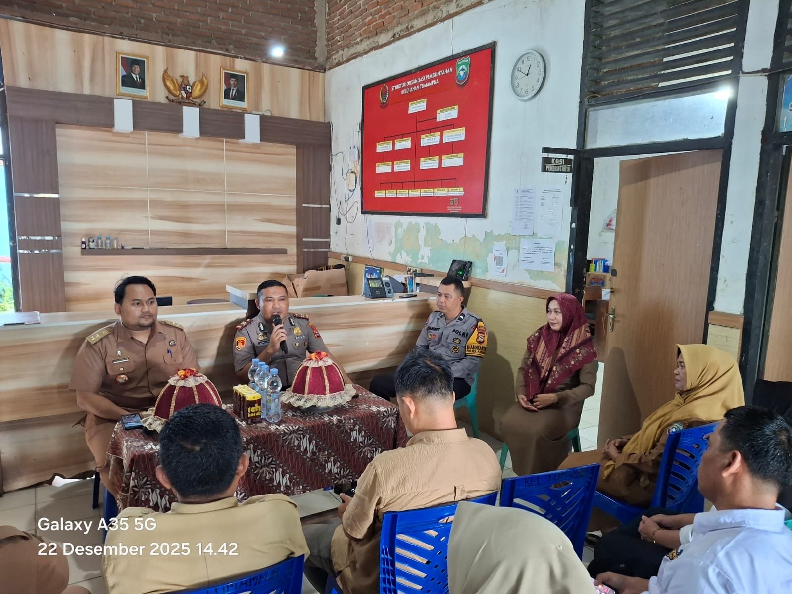 Bidik-jurnalis.com, PANGKAJENE — Kapolsek Pangkajene IPTU Hasrul, S.Sos., didampingi Bhabinkamtibmas beserta jajaran, melaksanakan kunjungan ke Kantor Kelurahan Tumampua dalam rangka silaturahmi dan mempererat hubungan kemitraan dengan pemerintah kelurahan serta tokoh masyarakat setempat. Kegiatan tersebut berlangsung pada Senin, 22 Desember 2015, sekitar pukul 14.00 WITA, bertempat di Aula Kantor Kelurahan Tumampua, Jalan Dg. Bonto, Kecamatan Pangkajene, Kabupaten Pangkep.