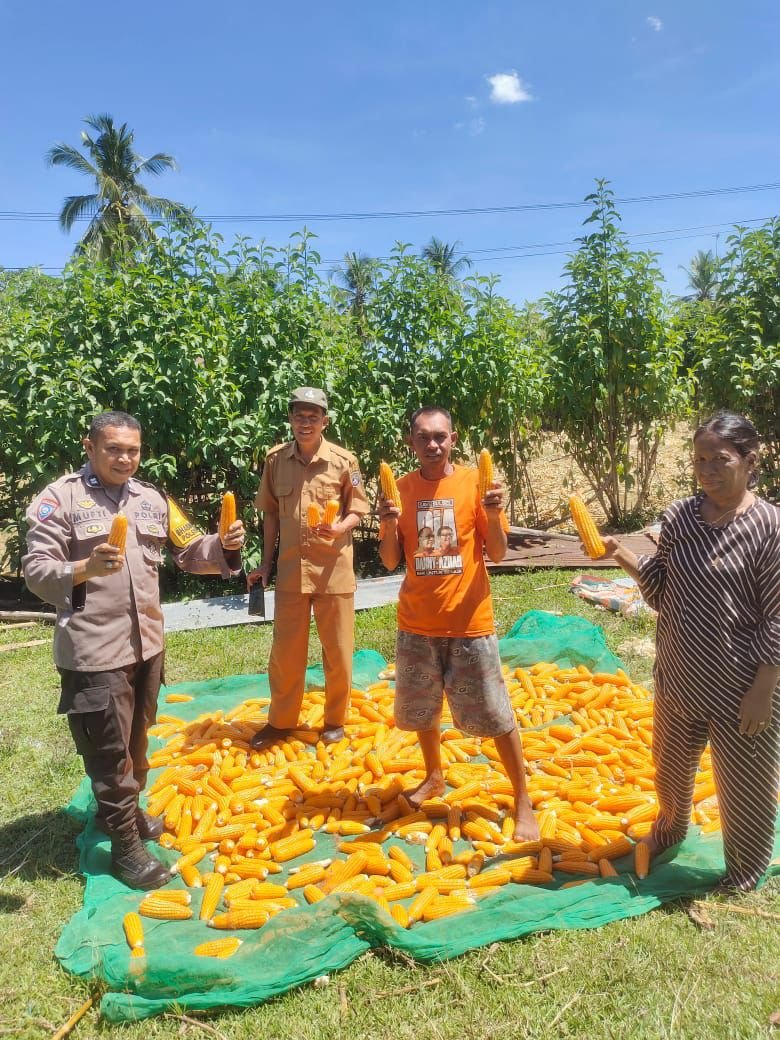 Aiptu Mufti, S.H., terlihat berbaur dengan para petani, memberikan semangat dan motivasi agar mereka tetap optimis dalam mengelola pertanian. Selain itu, ia juga memantau langsung proses panen jagung, memastikan kelancaran kegiatan tersebut.