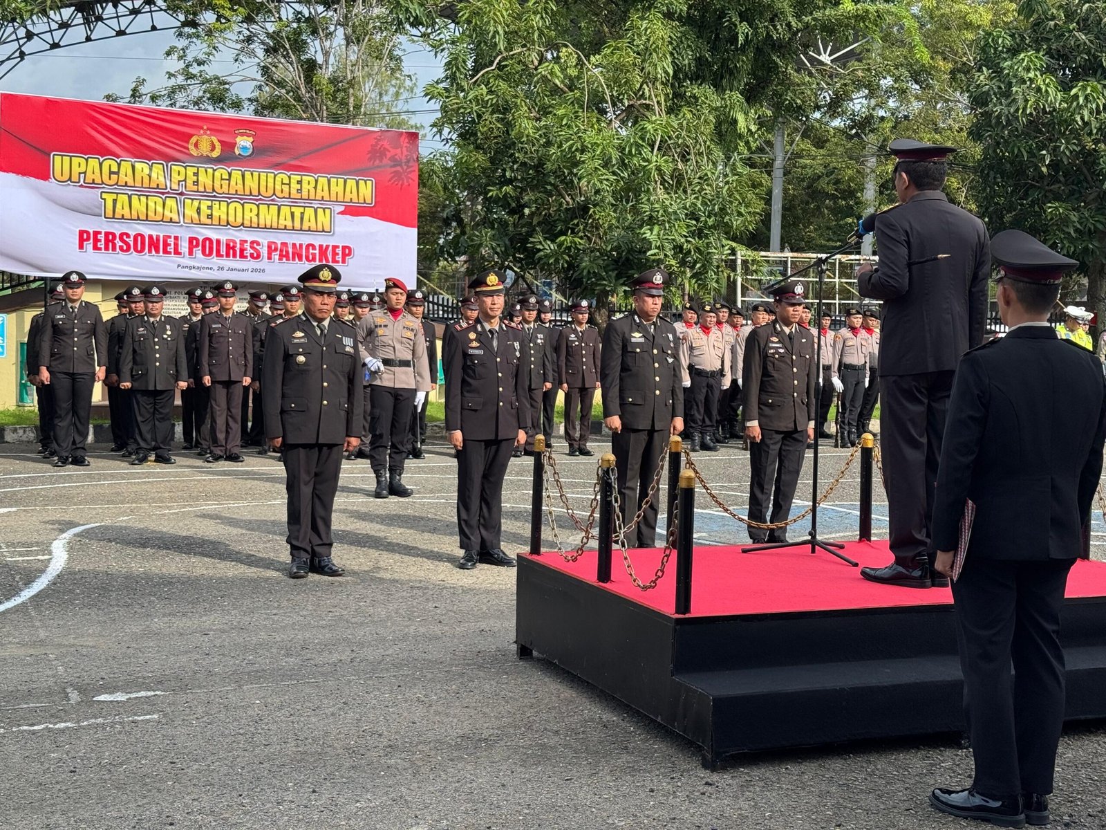 Upacara penganugerahan tersebut dipimpin langsung oleh Kapolres Pangkep, dan dihadiri oleh Wakapolres Pangkep, para Pejabat Utama Polres Pangkep, Kapolsek jajaran, serta perwira, bintara, dan ASN Polres Pangkep.
