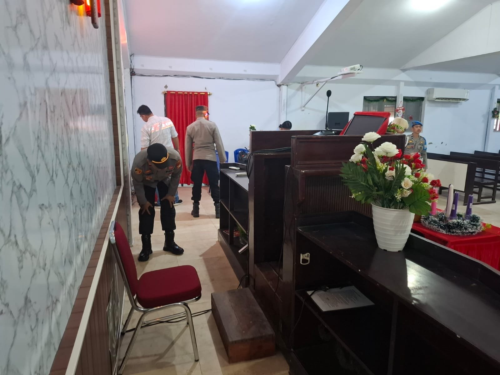 Guna memastikan keamanan dan kenyamanan jemaat dalam melaksanakan ibadah, Kapolsek Pangkajene IPTU Hasrul, S.Sos., memimpin langsung pelaksanaan pengamanan bersama personel Polsek Pangkajene. Pengamanan dilakukan melalui sterilisasi area gereja, baik di dalam maupun di luar ruangan, serta pemeriksaan barang bawaan jemaat yang memasuki lokasi ibadah sebagai langkah antisipasi terhadap potensi gangguan keamanan.