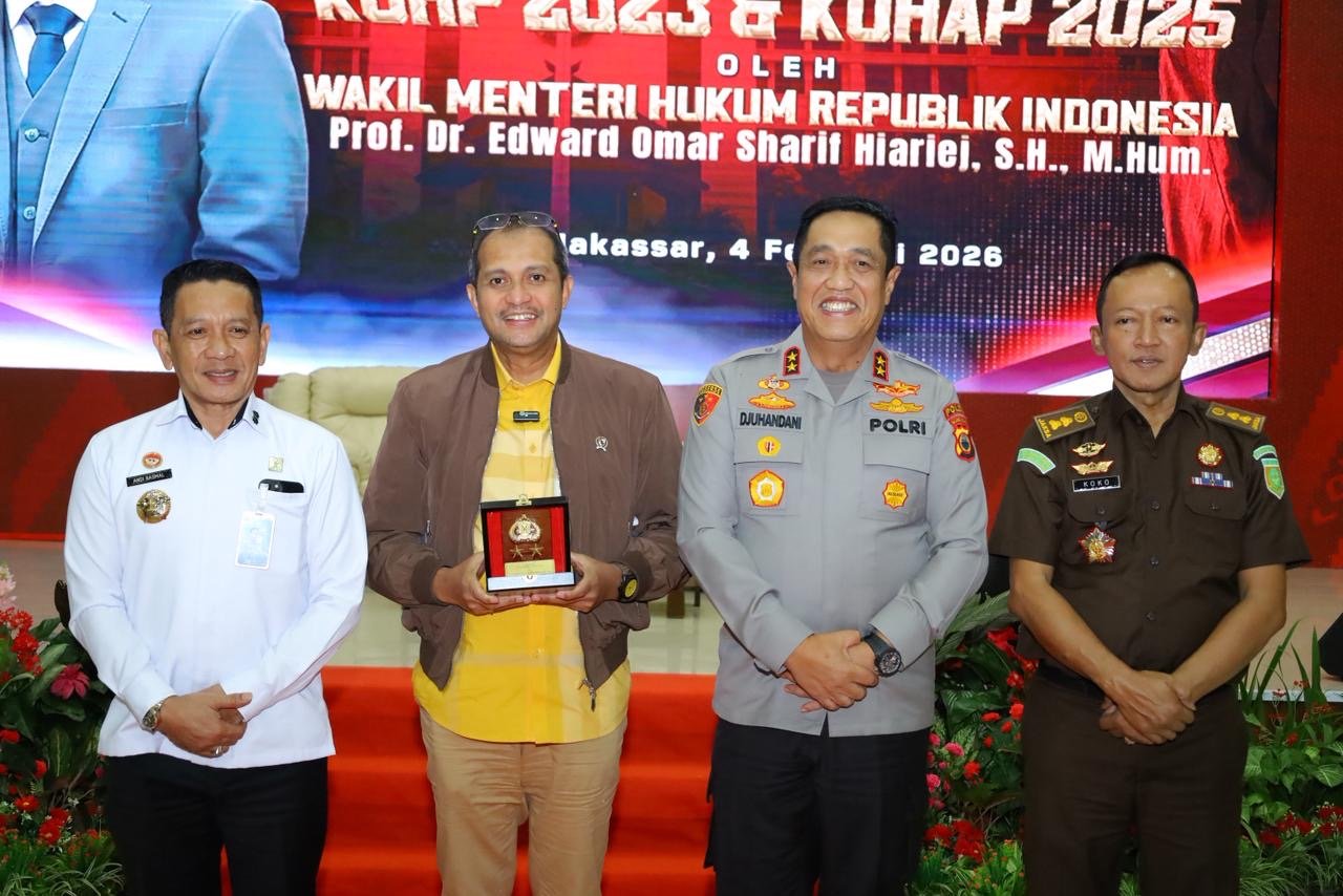 Dalam sambutannya, Kapolda Sulsel Irjen Pol. Djuhandhani Rahardjo Puro menyampaikan ucapan selamat datang dan terima kasih kepada Wakil Menteri Hukum RI atas kesediaannya memberikan pembekalan kepada jajaran Polda Sulsel. Kapolda menegaskan bahwa kegiatan ini menjadi bekal penting bagi personel Polri, khususnya penyidik, dalam menghadapi implementasi aturan hukum yang baru.