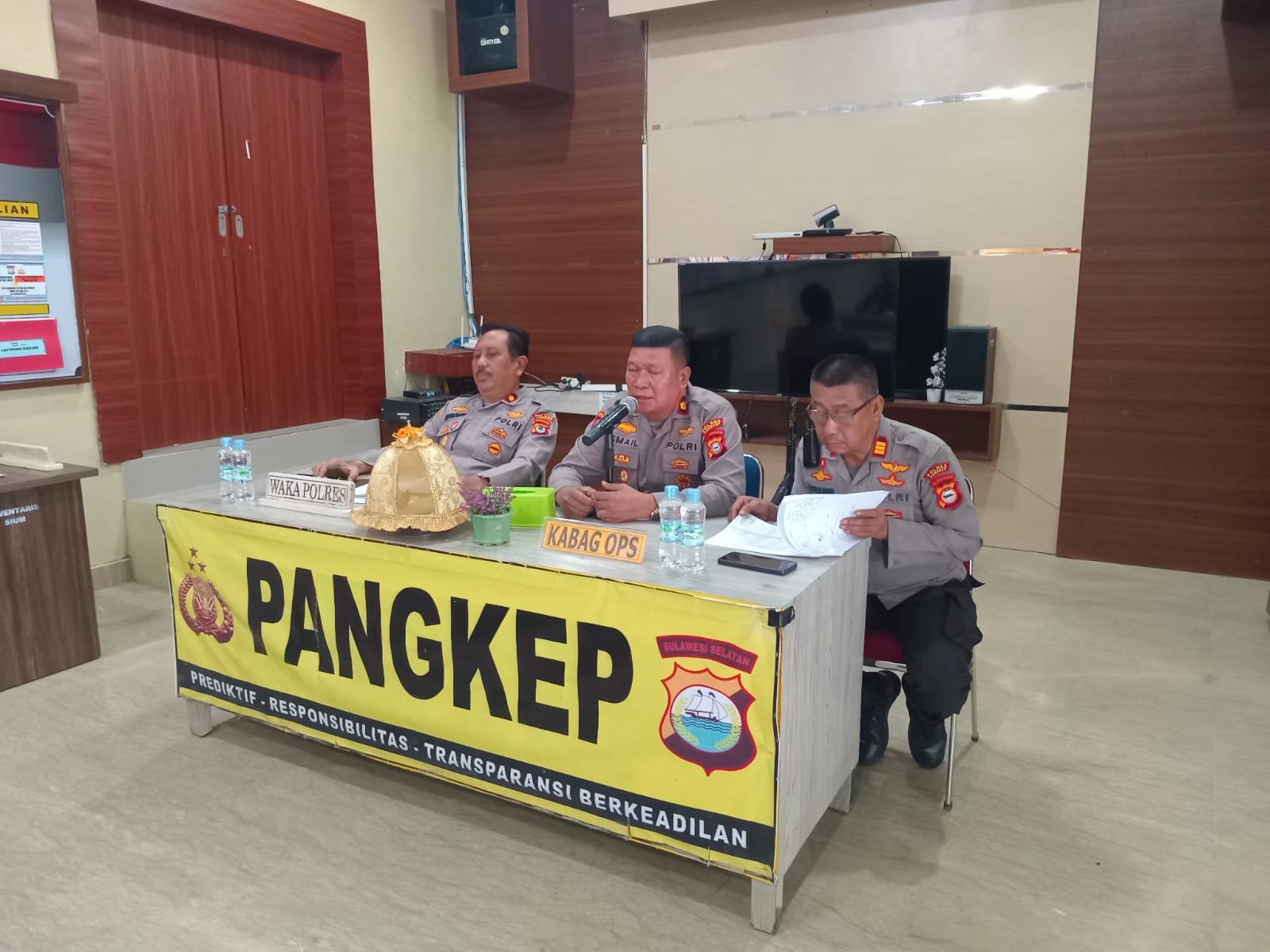 Rapat koordinasi dilaksanakan pada hari Kamis, 5 Juni 2025, pukul 09.00 WITA, bertempat di ruang aula Andi Mappe Polres Pangkep. Pertemuan dipimpin langsung oleh Wakapolres Pangkep, KOMPOL SUGENG SUPRIJANTO, S.Pd., M.H., didampingi oleh Kabag Ops Polres Pangkep, KOMPOL ISMAIL S.E., M.M., dan Kasubbagbin Ops Polres Pangkep, AKP SYARLIS NATSIR.