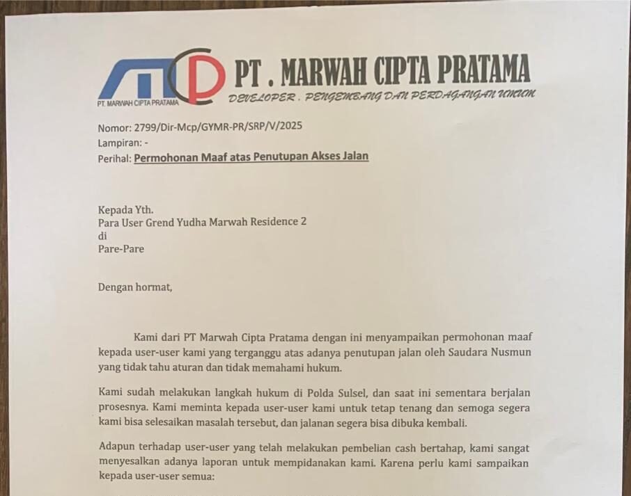 Bidik-jurnalis.com, Makassar – PT Marwah Cipta Pratama, selaku Developer Grend Yudha Marwah Residence Tahap 2, secara resmi menyampaikan permohonan maaf yang mendalam kepada seluruh user-user perumahan tersebut atas ketidaknyamanan yang timbul akibat penutupan akses jalan yang dilakukan oleh Saudara Nusmun.