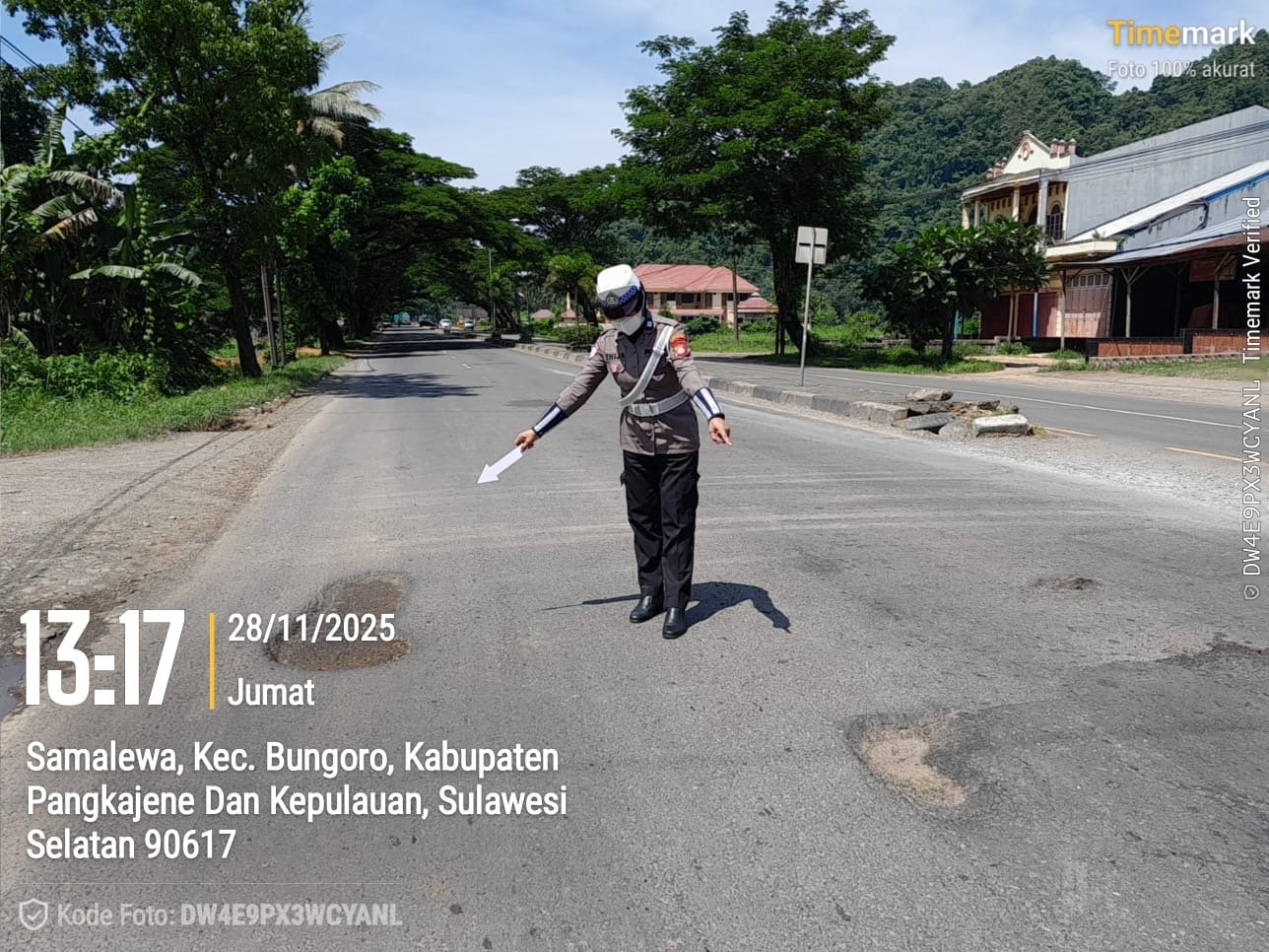 Bidik-jurnalis.com, PANGKEP – Satgas Preemtif Operasi Zebra Pallawa 2025 Polres Pangkep kembali melaksanakan kegiatan pencegahan kecelakaan lalu lintas dengan melakukan pengecekan kondisi jalan di sepanjang Jalan Poros Trans Sulawesi, Jumat (28/11/2025) sekitar pukul 13.30 Wita.