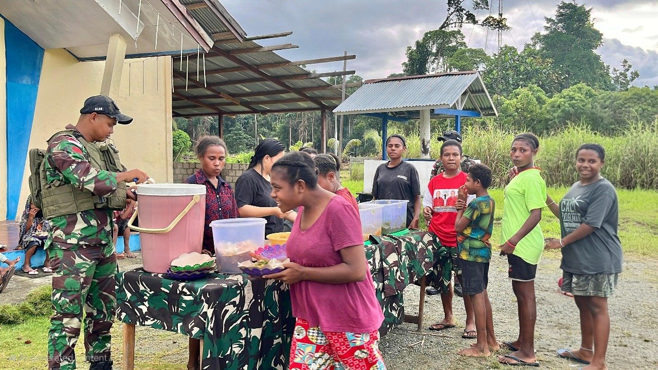 Kegiatan yang dipimpin langsung oleh Danpos Scofro Lama, Letda Inf Christian Mamangkey, disambut antusias oleh puluhan warga, mulai dari anak-anak hingga orang tua, berkumpul di lokasi kegiatan untuk menikmati sajian makanan bergizi yang disiapkan khusus oleh para prajurit. Kegiatan ini menjadi bukti nyata kepedulian Satgas terhadap kesejahteraan warga perbatasan, khususnya dalam hal pemenuhan gizi yang layak.