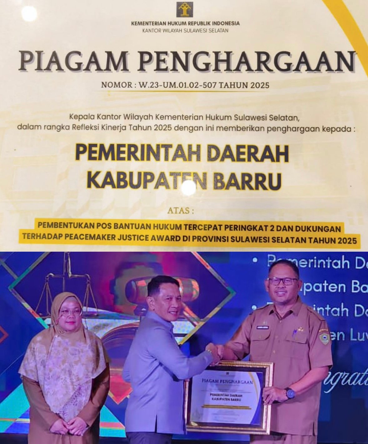 Bidik-jurnalis.com, Makassar – Tahun Pertama Pasangan Bupati Andi Ina Kartika Sari – Wabup Abustan A. Bintang, membangun Visi Barru Berkeadilan, langsung mendapatkan apresiasi dari Kanwil Kementerian Hukum Sulsel berupa Piagam Penghargaan Pembentukan Pos Bantuan Hukum Tercepat Kedua dan Dukungan terhadap Peace Maker Award di Provinsi Sulawesi Selatan Tahun 2025.