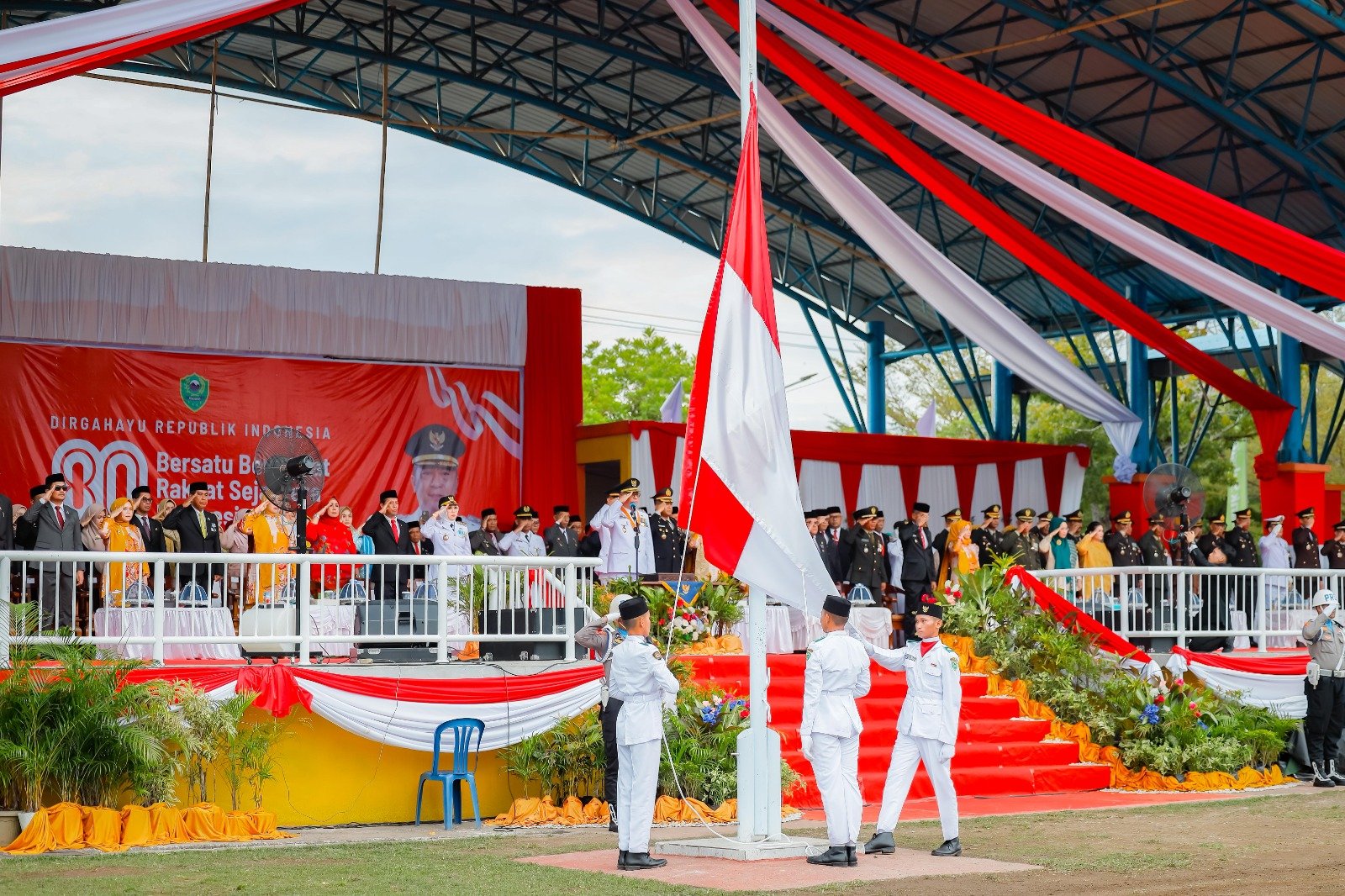 Pelaksanaan upacara dimulai pukul 17.00 Wita dan berakhir pukul 18.00 Wita berjalan tertib dan khidmat. Para Pasukan Pengibar Bendera Pusaka (Paskibraka) melaksanakan tugas mulianya dengan sempurna sejak memasuki lapangan, membentuk formasi HUT RI KE-80, Penurunan Bendera hingga penyerahan duplikat Bendera Pusaka ke Inspektur Upacara.