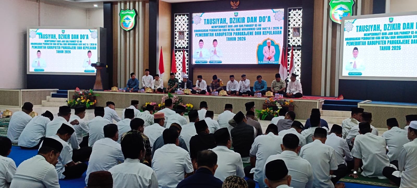 Bidik-jurnalis.com, Pangkep — Pemerintah Kabupaten Pangkajene dan Kepulauan menggelar kegiatan Tausiyah, Dzikir, dan Do’a Bersama dalam rangka memperingati Hari Jadi ke-66 Kabupaten Pangkep Tahun 2026, yang dirangkaikan dengan peringatan Isra Mi’raj Nabi Muhammad SAW 1447 H / 2026 M. Kegiatan berlangsung pada Jumat (13/02/2026) sekitar pukul 14.30 WITA, bertempat di Ruang Pola Pemda Pangkep.